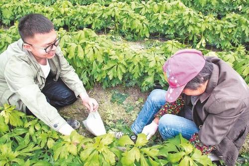 眼下正值江油附子的修根期,4月7日,在綿陽江油市大康鎮(zhèn)舊縣村江油市鑫生附子中藥材種植專業(yè)合作社種植基地,30余名工人用附鏟刨開植株附近的泥土,露出附子根系,除掉側(cè)芽,留下1~2個健碩的子根。但與以往修根不同的是,這次工人在附子根部放置了一個5厘米大小的白色“藥包”。修根現(xiàn)場,綿陽市農(nóng)業(yè)科學(xué)研究院中藥材團隊研究人員也忙個不停,指導(dǎo)工人正確放置藥包”后,再蓋上泥土。