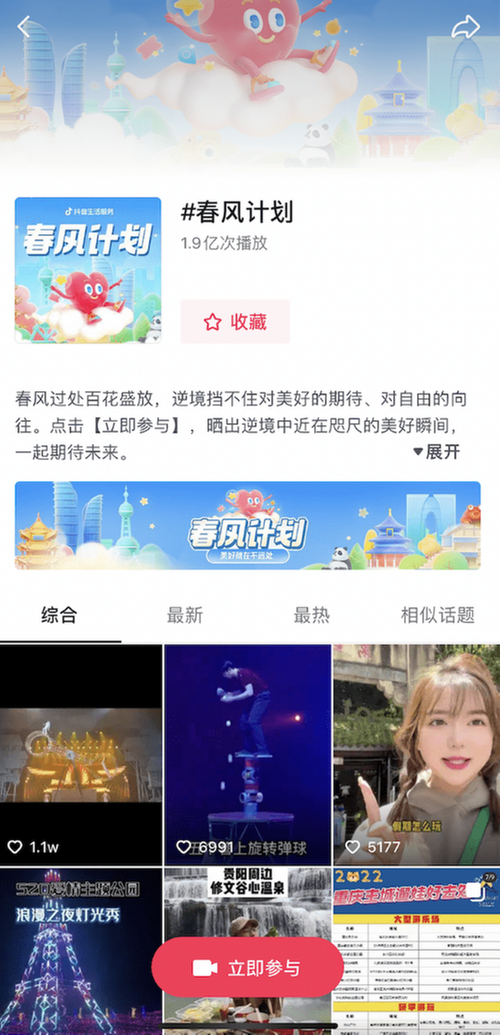 4月初,抖音生活服務(wù)華西直營中心從商家實際需求出發(fā),聯(lián)合樂山市、綿陽市餐飲行業(yè)協(xié)會、重慶市民宿產(chǎn)業(yè)協(xié)會等部門,攜手啟動了復(fù)蘇專項“春風(fēng)計劃”。截至5月中旬,項目已開展一月有余,覆蓋四川、重慶、云南三地商家1600余個,通過內(nèi)容種草助力商家提升門店獲客能力。項目總話題#春風(fēng)計劃,已突破1.9億播放量;聚合熱點內(nèi)容#懷念那個大口吃肉的成都、#五一重慶游玩攻略等共計11個話題,總曝光已突破800萬;數(shù)百個商家積極投稿短視頻,分享自身優(yōu)惠活動,吸引客流。