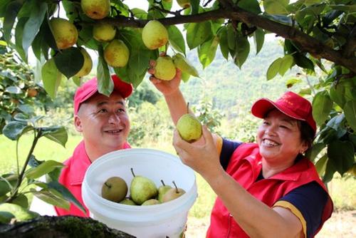 7月13日,瀘州市納溪區(qū)白節(jié)鎮(zhèn)黨員青年志愿者來(lái)到青風(fēng)村梨子基地里,幫助果農(nóng)采摘梨子。
