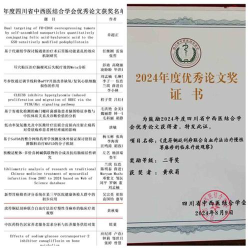 近日,四川省中西醫(yī)結(jié)合學(xué)會(huì)在成都召開(kāi)“2024年四川省中西醫(yī)結(jié)合大會(huì)”,共評(píng)選出42篇優(yōu)秀論文,遂寧射洪市中醫(yī)院內(nèi)一科護(hù)士長(zhǎng)黃秋菊撰寫(xiě)的“虎符銅砭刮痧聯(lián)合自血療法治療慢性蕁麻疹的臨床療效觀(guān)察”榮獲“優(yōu)秀論文二等獎(jiǎng)”。