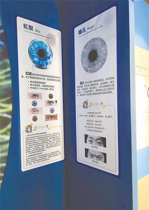 目前人臉識別技術(shù)依靠的就是虹膜識別,關(guān)于虹膜,館內(nèi)有著詳細(xì)的介紹、說明,其中一面五彩斑斕、像向日葵般的墻體,模擬的就是虹膜的樣子,它位于角膜和晶狀體之間,透過角膜就可以看到它,虹膜中間的圓形拱門模擬的就是瞳孔(它是虹膜中心的小圓孔),瞳孔的大小是由虹膜控制調(diào)節(jié)的,類似照相機(jī)的光圈,可以隨光線的強(qiáng)弱縮小或變大,光線強(qiáng)時,瞳孔收縮,光線暗時,瞳孔放大。瞳孔的大小會隨年齡、人種、情緒變化、目標(biāo)遠(yuǎn)近、屈光狀態(tài)等發(fā)生變化。