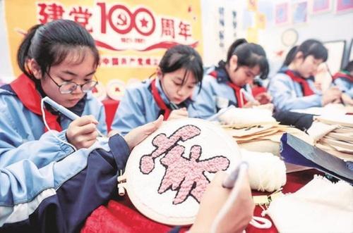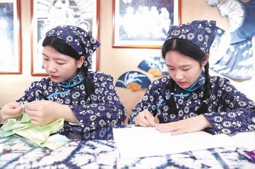 近年來(lái),廣安華鎣市把造紙、藍(lán)染、精書彩繡等特色傳統(tǒng)手工藝傳承納入學(xué)生素質(zhì)教育的重要內(nèi)容,在全市中小學(xué)校及幼兒園開(kāi)設(shè)了傳統(tǒng)手工藝?yán)碚摵蛯?shí)踐課程,通過(guò)“心育”和“美育”的有機(jī)結(jié)合,培養(yǎng)學(xué)生熱愛(ài)藝術(shù)、熱愛(ài)創(chuàng)造、熱愛(ài)生活的能力。圖①為4月25日,華鎣一中藍(lán)染創(chuàng)意工作坊的學(xué)生在該市舉辦的校園傳統(tǒng)手工藝集中展示活動(dòng)上,現(xiàn)場(chǎng)設(shè)計(jì)捆扎下缸浸染的圖案。圖②為4月25日,華鎣市雙河三小學(xué)生現(xiàn)場(chǎng)制作精書彩繡作品。