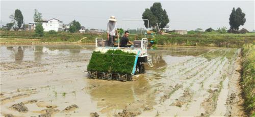 在鄰水縣九龍鎮(zhèn)種植大戶劉航澤的水稻田里,伴隨著農(nóng)機的轟鳴聲,插秧機在田間來回穿梭,將一株株嫩綠的秧苗整齊有序地插入水田,與傳統(tǒng)的人工插秧相比,機插秧更有效率。