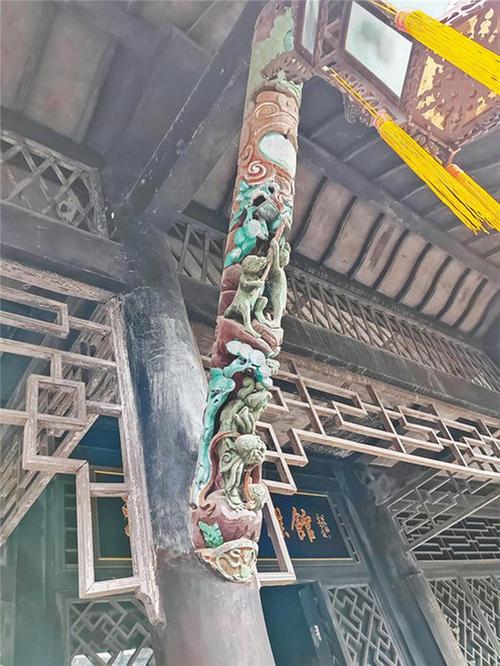 在講解員的帶領(lǐng)下,探班員穿過正中間的文魁門,才算正式進(jìn)入夕佳山民居游覽。只見其內(nèi)建筑均飾以雕刻雕塑,描金繪彩,掛匾懸對(duì),十分精美,無論門窗、脊頂、墻飾,還是木刻、石雕,制作都極具匠心,對(duì)研究中國民間建筑史尤其是川南民間建筑史具有極高的參考價(jià)值。