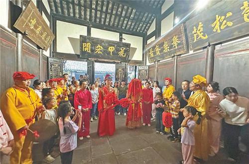 “說起來,婚俗表演與夕佳山民居之間還有一段歷史淵源。”講解員進(jìn)一步介紹,由于夕佳山民居的前身為黃氏家族所有,且黃家兒女眾多,一共在這里生活過十二代人,這樣的大家族嫁娶就成了當(dāng)?shù)氐臒狒[大喜事,所以只要一提到結(jié)婚嫁娶就想到夕佳山黃家舉辦的婚禮,川南婚俗也就深深烙進(jìn)了當(dāng)?shù)厝诵睦铩?/p>
