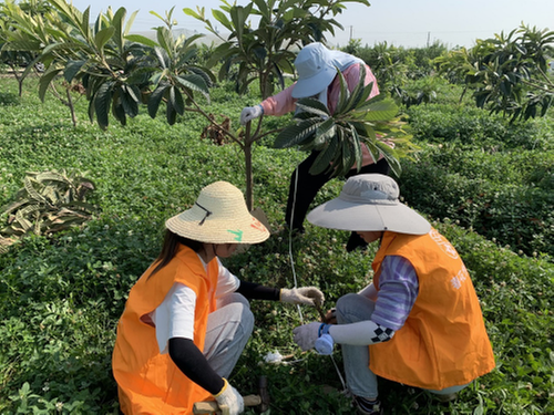 之后隊員們向果農(nóng)詢問當(dāng)前在枇杷種植上所遇到的防護(hù)、水肥管理等問題,并發(fā)放了團(tuán)隊制作的枇杷種植技術(shù)手冊。“春花枇杷”是全球首創(chuàng)避凍栽培枇杷,手冊詳細(xì)記錄了從種苗栽培管理到疏花疏果等全部操作規(guī)范,能夠幫助農(nóng)戶更好地種出枇杷“致富果”。