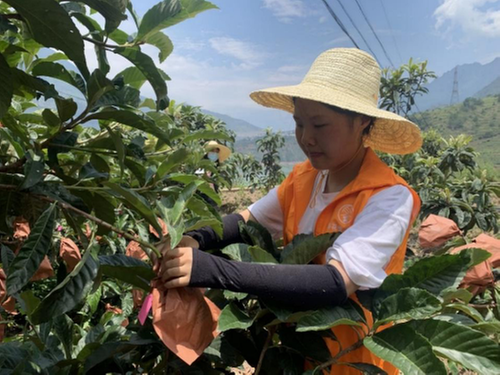 緊接著,為防止蟲鳥啄食物枇杷,隊員們馬不停蹄地投入到枇杷套袋工作中。將雙手分別放在枇杷紙袋兩側(cè),向上套枇杷,將枇杷裝入紙袋……一番操作下來,果農(nóng)們紛紛豎起大拇指。