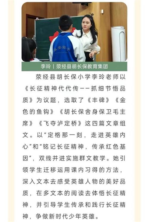 公開課中,滎經(jīng)縣胡長(zhǎng)保小學(xué)李玲教師以“長(zhǎng)征精神代代相傳”為議題,選取了統(tǒng)編教材課文《豐碑》《金色的魚鉤》《飛奪瀘定橋》這三篇文章與校本課程課文《胡長(zhǎng)保舍身保衛(wèi)毛主席》形成組合。引領(lǐng)學(xué)生深入文本去感受英雄人物的內(nèi)心世界,通過(guò)多文本的閱讀去體悟長(zhǎng)征精神,踐行長(zhǎng)征精神,爭(zhēng)做新時(shí)代好少年。