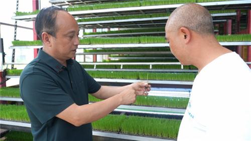 在循環(huán)智能育秧機上,秧苗整齊排列,葉片舒展、長勢均勻,已進入立針期。通過設置循環(huán)智能育秧機的自動噴灌、控溫、控濕、控光照等功能,可以有效縮短育秧周期,且不受極端天氣影響,發(fā)芽率更高。
