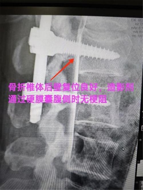 48歲的王女士近日因外傷入院,CT檢查結(jié)果顯示腰1椎體爆裂骨折,骨折累及前中柱,椎體后壁骨折塊突入椎管,壓迫硬膜囊??剖壹怪鶊F隊經(jīng)過深入討論,一致認(rèn)為該患者骨折屬于不穩(wěn)定性,若不及時治療,有極高的癱瘓風(fēng)險,應(yīng)盡量采用創(chuàng)傷較小術(shù)式早期手術(shù)結(jié)合術(shù)中椎管造影確保手術(shù)效果。