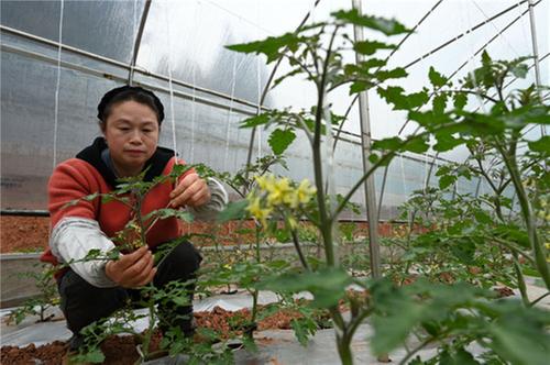 2月18日,內江市東興區(qū)田家鎮(zhèn)萬年村金元種植家庭農(nóng)場,農(nóng)民正在鋼架大棚里對西紅柿枝蔓進行吊蔓管理。