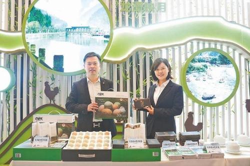 侯中杰(右)和劉曉崗展示舊院黑雞相關(guān)產(chǎn)品。
