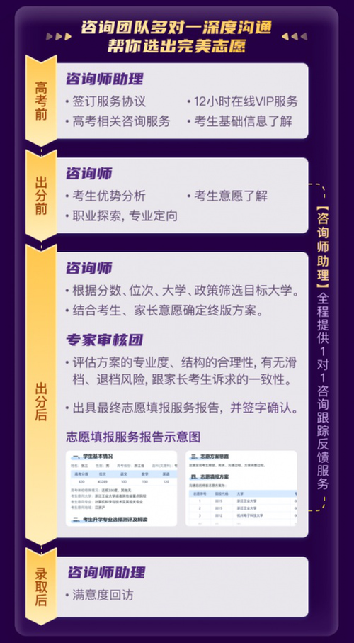 同時(shí),志愿填報(bào)專業(yè)審核團(tuán)還將聯(lián)席把關(guān),充分評(píng)估方案的專業(yè)度、結(jié)構(gòu)的合理性,以及有無(wú)滑檔、退檔風(fēng)險(xiǎn),和家長(zhǎng)考生訴求的一致性等等,最終出具志愿填報(bào)服務(wù)報(bào)告。