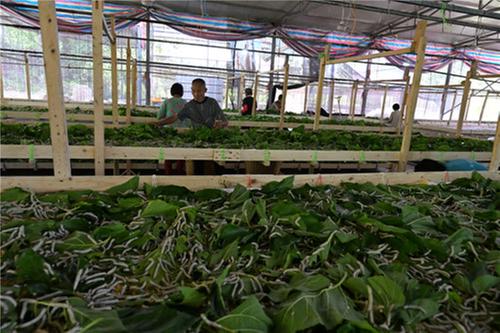 蠶農(nóng)在蠶棚里喂養(yǎng)第二批次蠶。