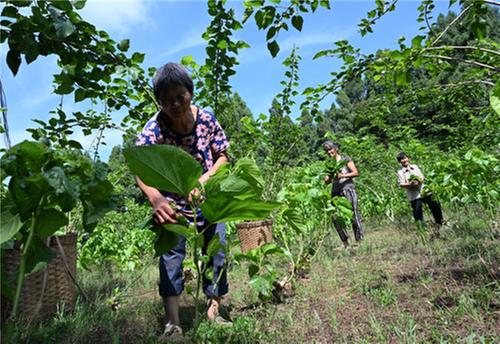 蠶農(nóng)在桑園里采摘桑葉。