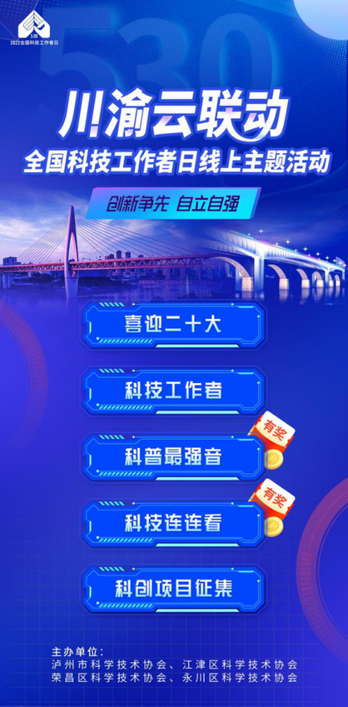 5月27日—31日,以“創(chuàng)新爭先,自立自強”為主題的2022年川渝云聯(lián)動全國科技工作者日線上主題活動成功舉行。瀘州市科協(xié)聯(lián)合重慶市江津區(qū)科協(xié)、榮昌區(qū)科協(xié)、永川區(qū)科協(xié),根據(jù)上級文件精神和部署要求,結(jié)合自身實際,認真謀劃,精心安排,在活動期間開展“喜迎二十大”“致敬最美科技工作者”“科普最強音”等5項各具特色、豐富多彩的重點活動,以滿足廣大群眾對新時代科技科普服務(wù)的需求。