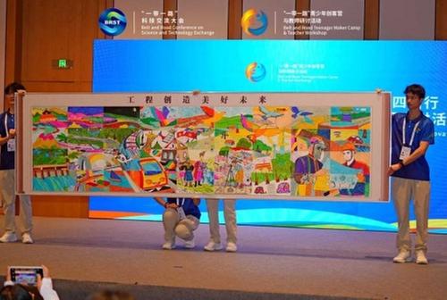 活動上展示了由“一帶一路”青少年及志愿者共同繪制的“美好未來”畫卷,各國青少年用豐富的色彩和線條以及具有特色的文化元素,生動表達了共建“一帶一路”廣大青少年親密攜手共創(chuàng)未來的美好愿景。
