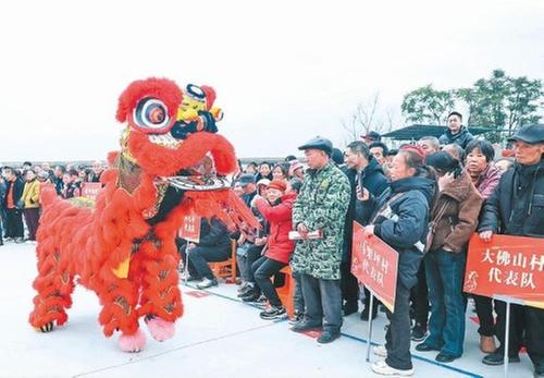 2月9日,廣安華鎣市的民間藝人巡回到永興鎮(zhèn)大佛山村,為當?shù)厝罕姾驮谕鈩展し掂l(xiāng)過年的鄉(xiāng)親表演舞獅、川劇變臉等節(jié)目,在歡樂喜慶的氛圍中迎接新春佳節(jié)的到來。圖為民間藝人正在進行舞獅表演。(邱海鷹 攝影報道)