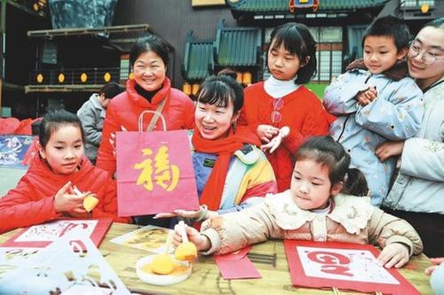 2月7日,瀘州市納溪區(qū)旅游部門聯(lián)合當?shù)貢覅f(xié)會,在山河明月·醉酒城特色街區(qū)開展“迎新春·送祝福”活動?,F(xiàn)場,書法家為市民和游客免費書寫春聯(lián)、贈送“福”字,志愿者積極指導小朋友體驗非遺技藝,讓傳統(tǒng)年俗煥發(fā)新活力。圖為志愿者指導小朋友們學習拓印技藝。(廖勝春 攝影報道)