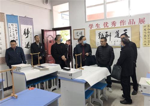 驗(yàn)收組到校后,先察看了校園環(huán)境及校園文化墻,對啟航樓一樓的書法長廊尤感興趣。然后驗(yàn)收組在會議室參觀了學(xué)校辦學(xué)成果,聽取張瑞坤校長對“書法進(jìn)校園”開展情況的匯報。為打造有品位有特色的校園文化,促進(jìn)學(xué)生全面發(fā)展,學(xué)校結(jié)合實(shí)際,將書法教學(xué)與語文教學(xué)相結(jié)合,保證了每周每班各有一節(jié)書法課;每天中午20分鐘硬筆和毛筆練習(xí)時間;每周二、三、四分別是初一、初二、初三書法興趣小組活動課,并于上半年舉辦了前鋒區(qū)書法大賽。