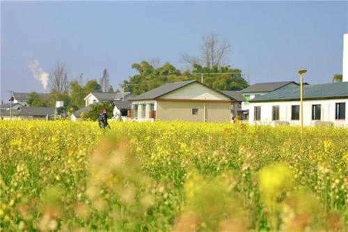 活動現(xiàn)場,金黃的油菜花田與白墻黛瓦的川西民居相映成趣,勾勒出詩意盎然的田園畫卷?;顒友埩饲嗌癖就翗逢?ldquo;麻湯樂隊”現(xiàn)場演出,音樂與自然環(huán)境和諧共鳴,讓每一位游客都沉浸在這場視聽盛宴中。