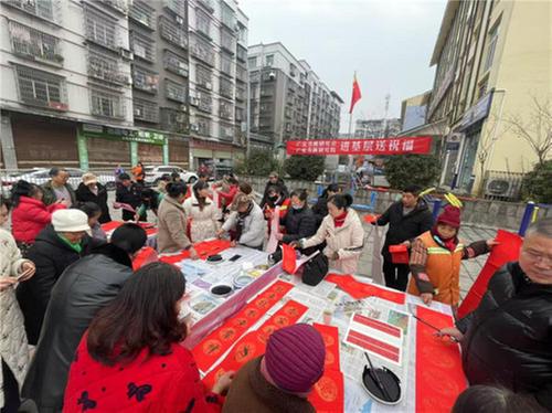 活動現(xiàn)場,桌子整齊擺放,筆墨紙硯一應(yīng)俱全。廣安市書法研究院的老師們揮毫潑墨,一幅幅寓意吉祥、飽含祝福的對聯(lián)在筆下誕生,贏得了居民們的陣陣掌聲和贊嘆。在書寫過程中,老師們還耐心地為居民講解春聯(lián)的文化底蘊(yùn)和書法藝術(shù)技巧,讓大家在欣賞美的同時,對傳統(tǒng)書法文化有了更加深刻的理解,現(xiàn)場氣氛熱烈而溫馨,充滿了節(jié)日的喜慶氛圍。