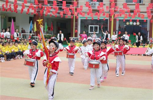 伴隨著激昂的音樂聲中,護旗手和鼓樂隊邁著鏗鏘有力的步伐走來,國歌奏響,鮮艷的五星紅旗冉冉升起,與藍天、白云交相輝映。全園師幼高唱國歌,用嘹亮的歌聲為祖國送上最美好的祝福。
