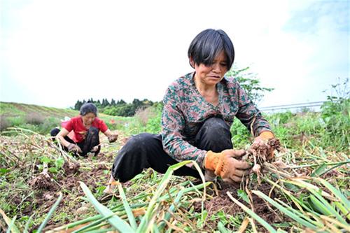 5月5日,四川省內江市東興區(qū)東興街道圣宴社區(qū),當?shù)剞r民搶抓農時采收大蒜,晾曬歸倉。