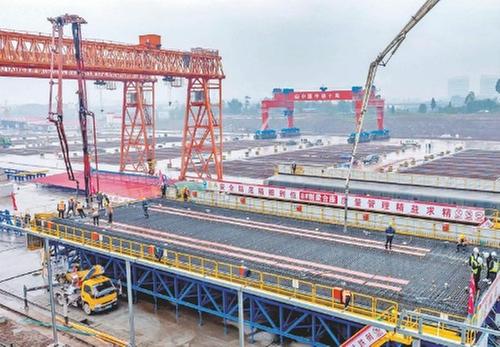 近日,承擔西渝高鐵廣安華鎣段共計610孔雙線簡支箱梁預制和架設任務的廣安東站制梁場正式投入使用,并于當日順利完成首榀箱梁澆筑。圖為建設者在廣安東站制梁場,冒雨澆筑首榀箱梁。