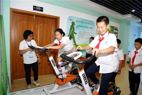 2023年9月20日,納溪中學附屬河東小學學生在納溪區(qū)校外活動中心科普體驗館體驗“腳踩發(fā)電”。王超明 攝