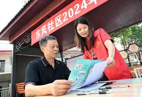 5月22日,內(nèi)江市東興區(qū)新江街道東風(fēng)社區(qū),志愿者向社區(qū)居民傳播文明知識(shí)。