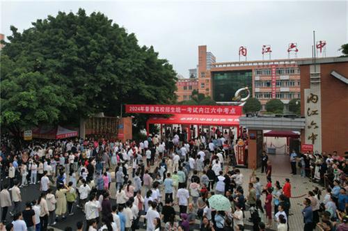6月7日,在四川省2024年普通高校統(tǒng)一考試內(nèi)江六中考點(diǎn),考生排隊(duì)進(jìn)入考場(chǎng)。