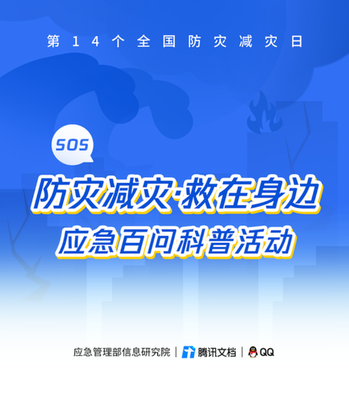 5月12日是我國第14個全國防災(zāi)減災(zāi)日,主題是“減輕災(zāi)害風(fēng)險 守護(hù)美好家園”。為進(jìn)一步推動防災(zāi)減災(zāi)宣傳周活動深入開展,應(yīng)急管理部信息研究院聯(lián)合騰訊文檔和騰訊QQ,在全國防災(zāi)減災(zāi)宣傳周活動期間共同開展“防災(zāi)減災(zāi)·救在身邊”全民應(yīng)急百問科普系列活動,通過線上“防災(zāi)減災(zāi)·救在身邊:應(yīng)急百問科普指南”和“應(yīng)急百問科普答題”,重點普及洪澇、臺風(fēng)、地震、森林草原火災(zāi)等災(zāi)害知識和防范應(yīng)對技能。