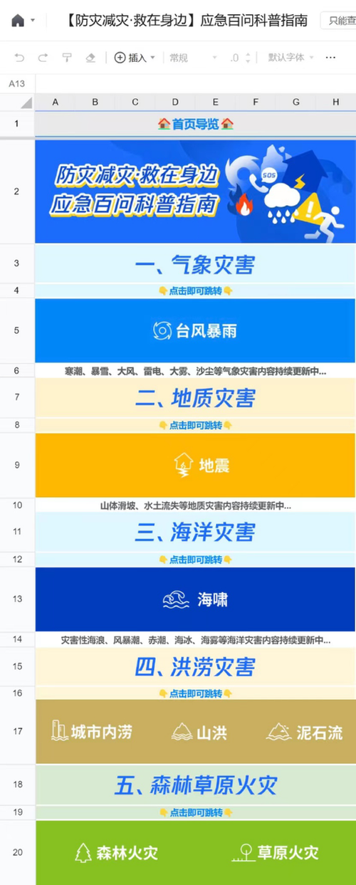 我國是世界上自然災(zāi)害最為嚴(yán)重的國家之一,災(zāi)害種類多、分布地域廣、發(fā)生頻率高。開展全民自然災(zāi)害科普,提升大眾應(yīng)對極端天氣災(zāi)害的防災(zāi)減災(zāi)意識和應(yīng)急救護(hù)技能刻不容緩。在“救在身邊:應(yīng)急百問科普指南”中,重點涵蓋臺風(fēng)暴雨、地震、洪澇、海嘯、森林草原火災(zāi)等多種常見自然災(zāi)害的科普常識,并提供有效的防災(zāi)避險、應(yīng)急救護(hù)和災(zāi)后防范等技能和注意事項,以一份圖文并茂、易于分享的線上文檔,讓大家正確認(rèn)識自然災(zāi)害,深入了解防范應(yīng)急知識,并提高避險自救能力。