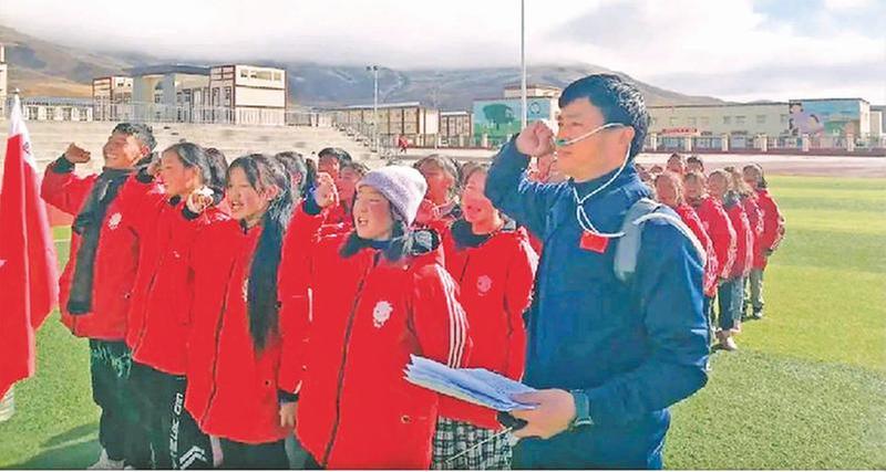 椒江支教老師與色達(dá)中學(xué)學(xué)生一同參加國(guó)旗下的宣誓活動(dòng)。