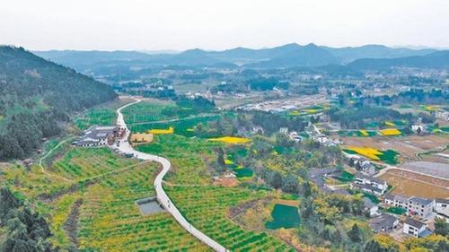 開車行駛在川北丘陵間,層層疊疊的良田、錯落有致的民居、競相開放的花朵……一幅幅春意盎然的鄉(xiāng)村美景圖映入眼簾。汽車拐進(jìn)一個小村,遠(yuǎn)遠(yuǎn)便看到一片花海掩映著的“跳蹬河山莊”幾個大字。