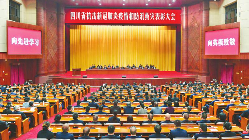 10時整,表彰大會開始。全場起立,高唱中華人民共和國國歌。國歌畢,全場肅立,向在抗疫斗爭中犧牲的烈士和逝世的同胞默哀。隨后,省委常委、組織部部長王正譜宣讀省委、省政府《關(guān)于表彰四川省抗擊新冠肺炎疫情先進個人和先進集體的決定》和省委《關(guān)于表彰四川省抗擊新冠肺炎疫情優(yōu)秀共產(chǎn)黨員和先進基層黨組織的決定》《關(guān)于表彰四川省防汛救災(zāi)優(yōu)秀共產(chǎn)黨員和先進基層黨組織的決定》。彭清華、尹力等為受表彰代表頒獎。