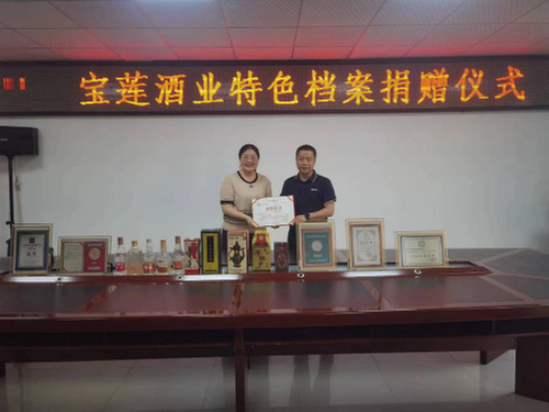 4月28日,資陽市檔案館舉辦了寶蓮酒業(yè)特色檔案捐贈儀式,資陽市檔案館向四川寶蓮酒業(yè)有限公司征集到一批反映酒廠發(fā)展過程中形成的具有歷史價值的實物檔案,包括1988年國家質(zhì)量審定委員會頒發(fā)的《中華人民共和國國家質(zhì)量獎“優(yōu)質(zhì)獎”》等各類證書5件、1976年產(chǎn)寶蓮古酒等不同年份的瓶裝酒10瓶,進一步豐富了館藏內(nèi)容,留存資陽市釀酒歷史與文化記憶。