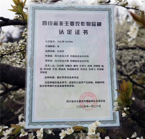 2023年12月,省農(nóng)業(yè)農(nóng)村廳對“紅韻李”新品種認定結(jié)果進行公示;2025年1月,四川省非主要農(nóng)作物品種認定委員會正式向選育單位(四川農(nóng)業(yè)大學(xué)、丹棱縣農(nóng)業(yè)農(nóng)村局)頒發(fā)《四川省非主要農(nóng)作物品種認定證書》,丹棱縣首個自主知識產(chǎn)權(quán)李新品種就此正式誕生。
