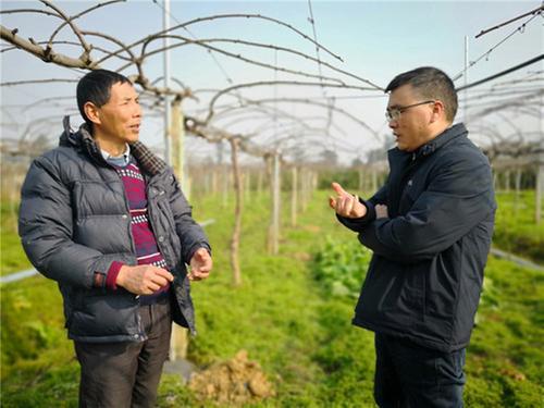 1月27日,眉山市彭山區(qū)活橋村村民李???,正在召集工人將自家的幾畝獼猴桃打水泥樁,建大棚。