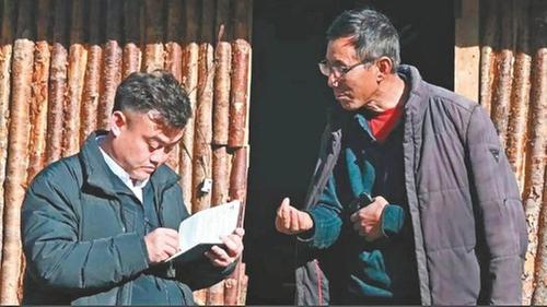 劉朋雨(左)進村入戶了解情況。