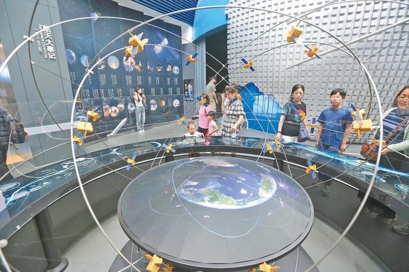 2.在“航空航天”展廳,家長(zhǎng)和孩子正在參觀北斗導(dǎo)航衛(wèi)星裝置。