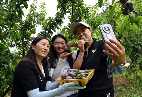 6月19日,內(nèi)江市東興區(qū)高梁鎮(zhèn)川主村,當(dāng)?shù)?ldquo;幫幫團(tuán)”成員在半山李生態(tài)農(nóng)場采摘生態(tài)李子。
