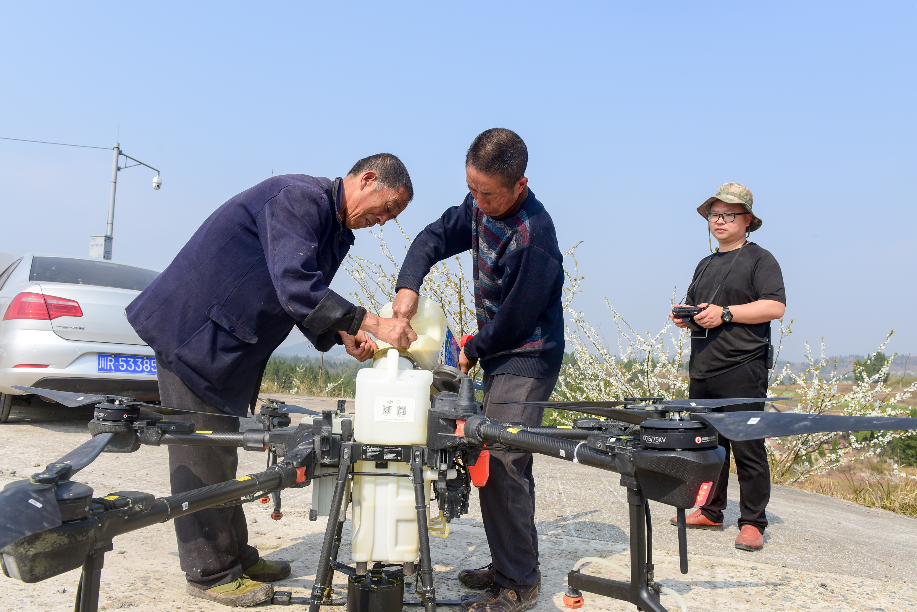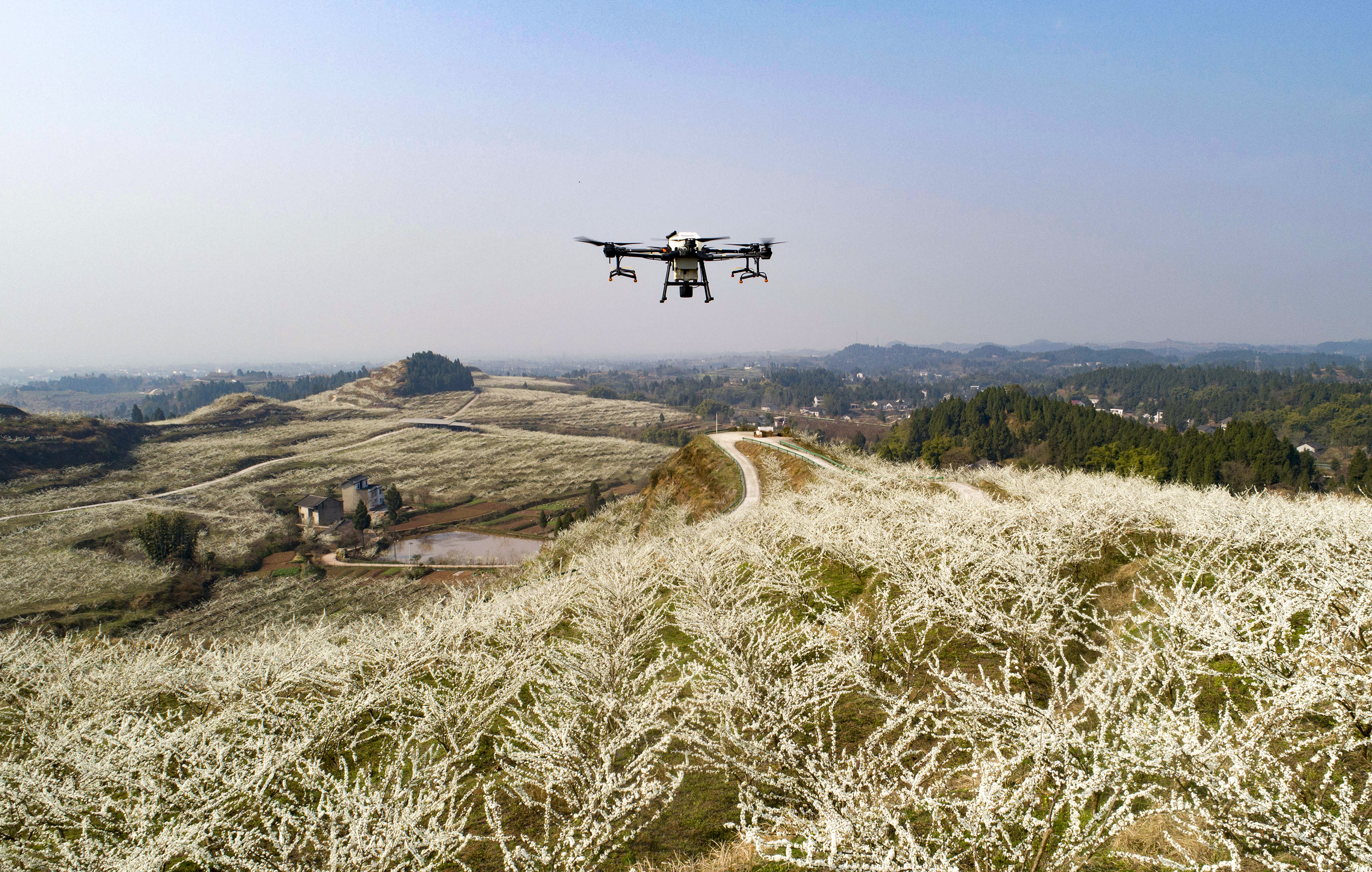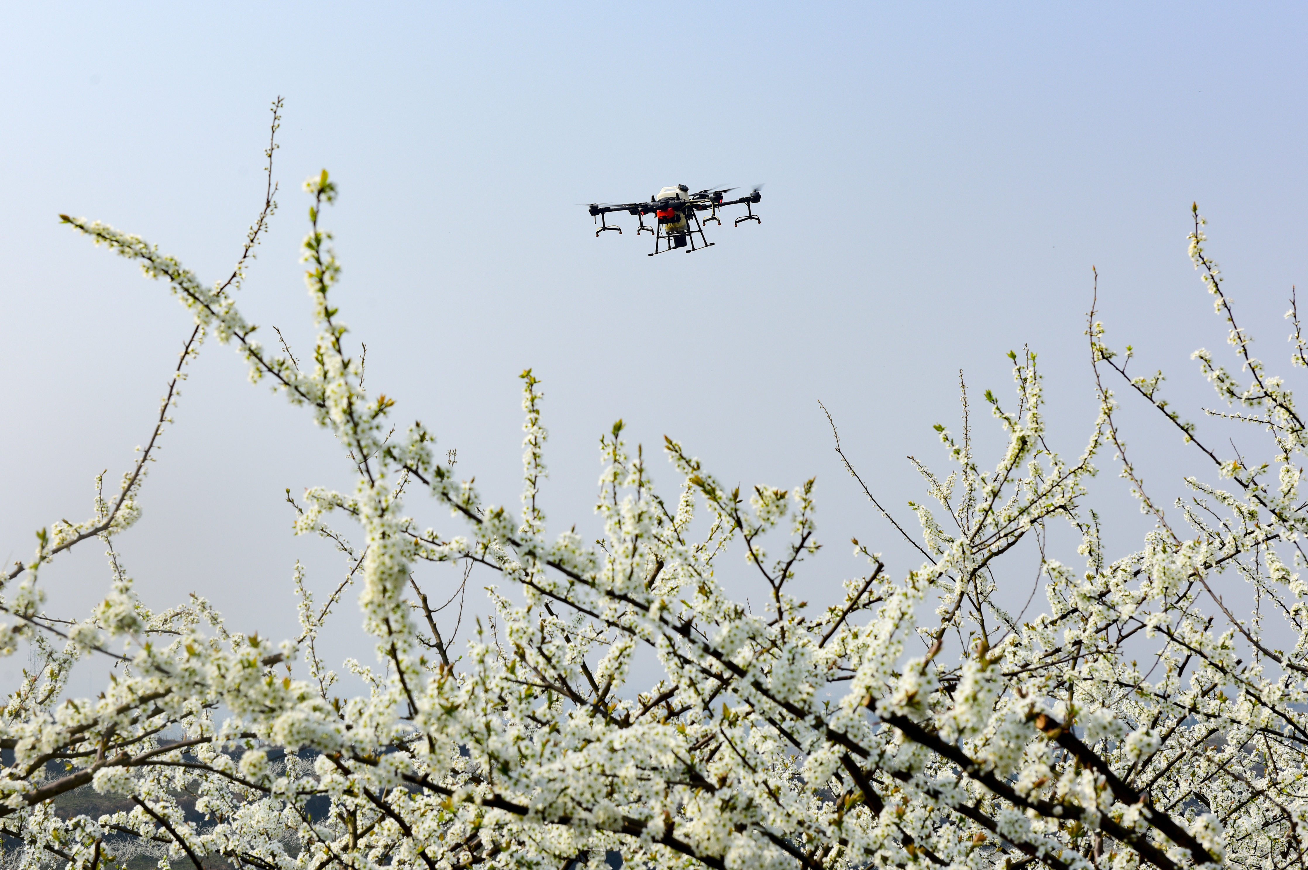 隨著氣溫回升,南充市高坪區(qū)走馬鎮(zhèn)喻家堰村紅星果業(yè)專(zhuān)業(yè)合作社種植的1400余畝李子樹(shù)進(jìn)入盛花期。2月22日,在專(zhuān)合社李子園內(nèi),工人正利用植保無(wú)人機(jī)為李花授粉,提高授粉效率,節(jié)約勞動(dòng)成本。
