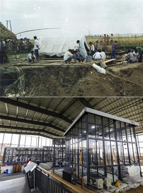 上圖為1986年,考古人員在三星堆遺址考古發(fā)掘現(xiàn)場工作。受限于當(dāng)時的條件,現(xiàn)場裸露在空氣之中,沒有被完全封閉保護(hù)起來(三星堆博物館供圖);下圖為3月10日在三星堆遺址考古發(fā)掘現(xiàn)場拍攝的4個大小不同的“考古艙”(新華社記者 沈伯韓 攝)。新華社發(fā)