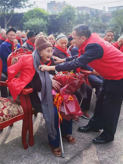 接下來,在彭山區(qū)社會治安志愿者協(xié)會會長劉統(tǒng)華介紹此次活動背景后,彭山區(qū)民政局副局長謝勤快、眉山市志愿服務(wù)聯(lián)合會副會長、眉山市社會治安志愿者協(xié)會、彭山區(qū)社會治安志愿者協(xié)會會長劉統(tǒng)華上臺,分別為104歲高壽的奶奶肖學(xué)彬老人送上節(jié)日禮物(紅色棉衣、圍巾、保暖手套),祝愿肖奶奶身體健康、萬事如意。彭山二小少先隊員代表為肖奶奶獻上鮮花,祝愿肖奶奶天天開心、笑顏如花。