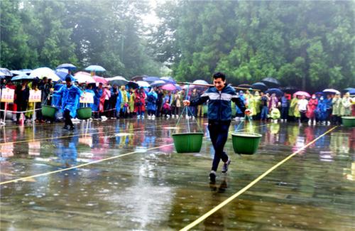 雖然天空中飄著雨,但活動現(xiàn)場激情澎湃。同樣的起點,選手們挑著稻谷,你追我趕,爭分奪秒,快速奔向終點。賽場周圍的村民們?yōu)樗麄儏群爸?,一點不輸氣勢。“在雨中挑著稻谷跑,就像我們平時自己在家曬糧食,遇到下雨天就要爭分奪秒地?fù)屖占Z食。”站在一旁觀看的村民游開銀說道。