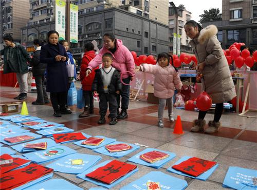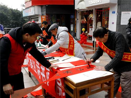 志愿者為群眾免費書寫春聯(lián)。王超明 攝