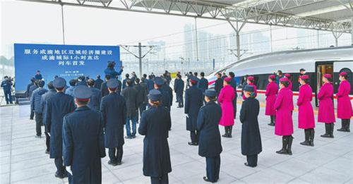 12月24日,服務(wù)成渝地區(qū)雙城經(jīng)濟(jì)圈建設(shè)成渝城際1小時直達(dá)列車首發(fā)活動以視頻連線形式在川渝兩地同步舉行。四川省委書記彭清華、中國國家鐵路集團(tuán)董事長陸東福在成都出席,重慶市委副書記、市長唐良智,四川省委副書記、代省長黃強在活動上講話。