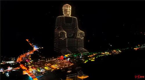 本次無人機(jī)表演中,3000架無人機(jī)編隊(duì)通過精心編排,在夜空中變幻出絢麗多彩的圖案和造型,如樂山大佛、金頂十方普賢、峨眉靈猴、雙龍戲珠、鳳凰和鳴、金蛇迎春等。岷江兩岸,眾多本地市民和外地游客共同欣賞了一場高空震撼的視覺盛宴。